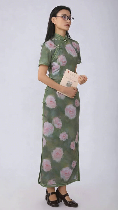 Muted Green Linen-Silk Qipao with Pink Rose Print